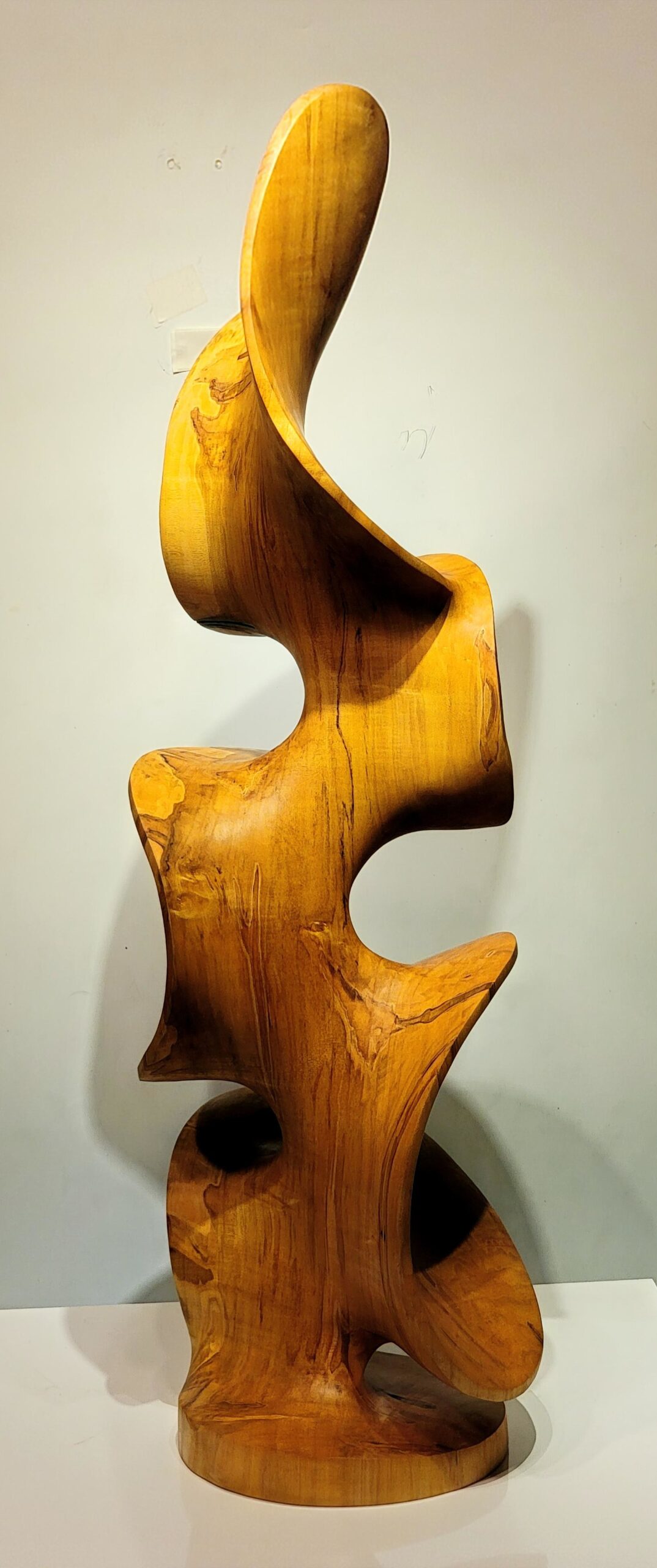This sculpture is a tall, vertical abstract form carved from Ambrosia Maple, emphasizing movement, balance, and organic flow.