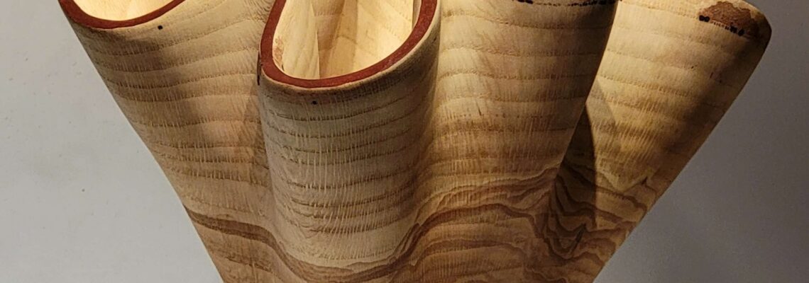 This beautiful form was sculpted from a figure piece of Pin Oak. The form was inspired by studying folded glass shapes. Sanded then sandblasted to accent the medullary rays and grain lines. Satin finish. Dims: 12.5″H x13”x12”