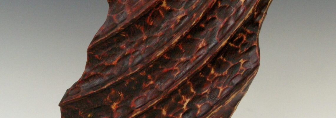 Abstract double ribbon form from eastern red cedar with a light Sho Sugi Ban finish. Sho Sugi Ban is a charred and cracked surface finish with Tung oil. Dims: 8″ Dia x 27″ Tall