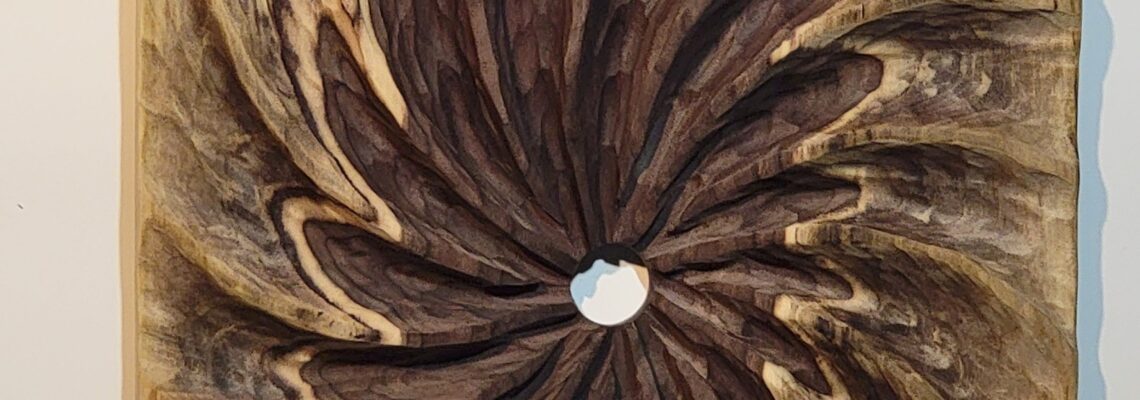 This sculpture is a wall-mounted relief carved from a single piece of Maple. It has an organic, flowing composition: deep, curved grooves radiate outward from a small circular opening near the center, creating a swirling, vortex-like effect.